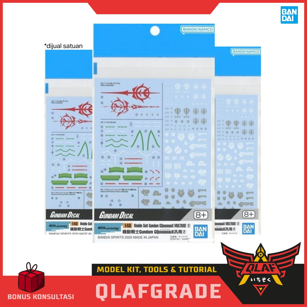 Keterangan Produk: Decal resmi nomor 140 berisi elemen grafis lanjutan dari Mobile Suit Gundam GQuuuuuuX, mencakup marking unit sekunder, kode taktis, simbol khusus pilot, aksen warna tambahan, serta detail panel kecil yang tidak tersedia di decal dasar. Dirancang untuk menyempurnakan tampilan mecha sesuai adegan spesifik dalam serial.