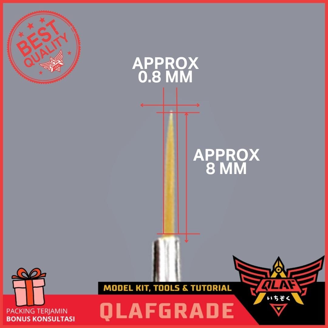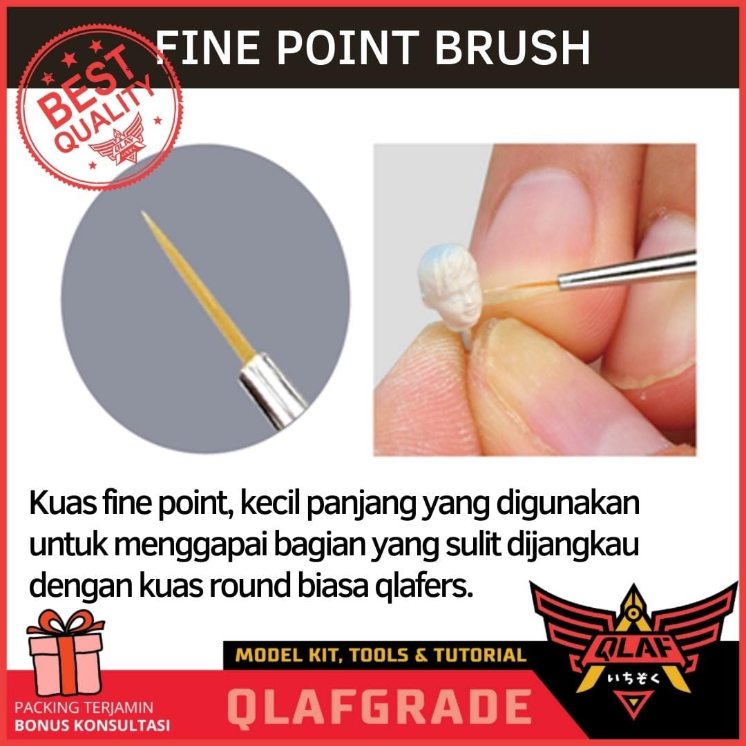 Kuas fine point, kecil panjang yang digunakan untuk menggapai bagian yang sulit dijangkau dengan kuas round biasa.