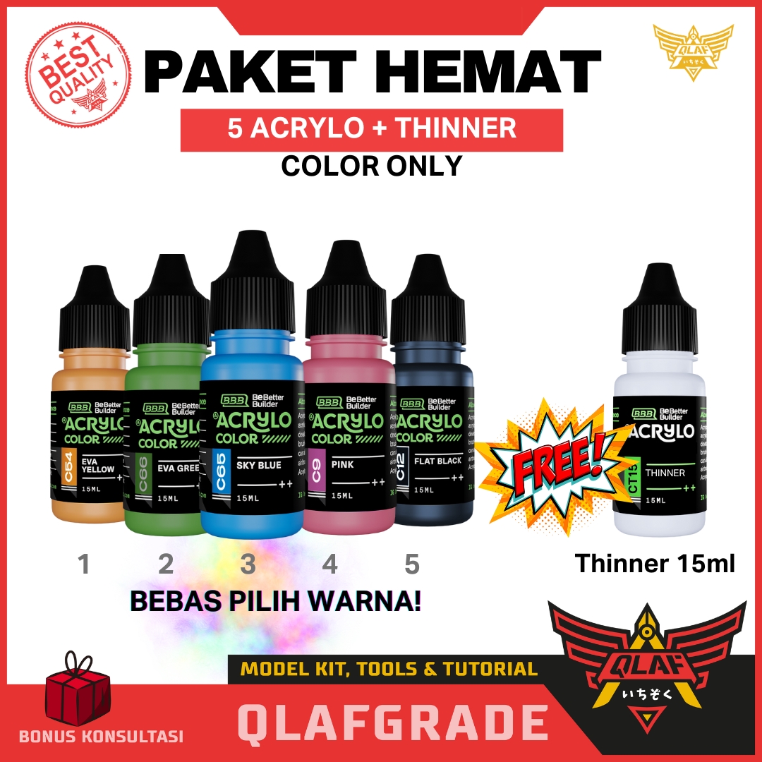 Berisi 5 buat cat Acrylo Color (Warna Bebas) sudah free 1 botol Acrylo Thinner 15 ml