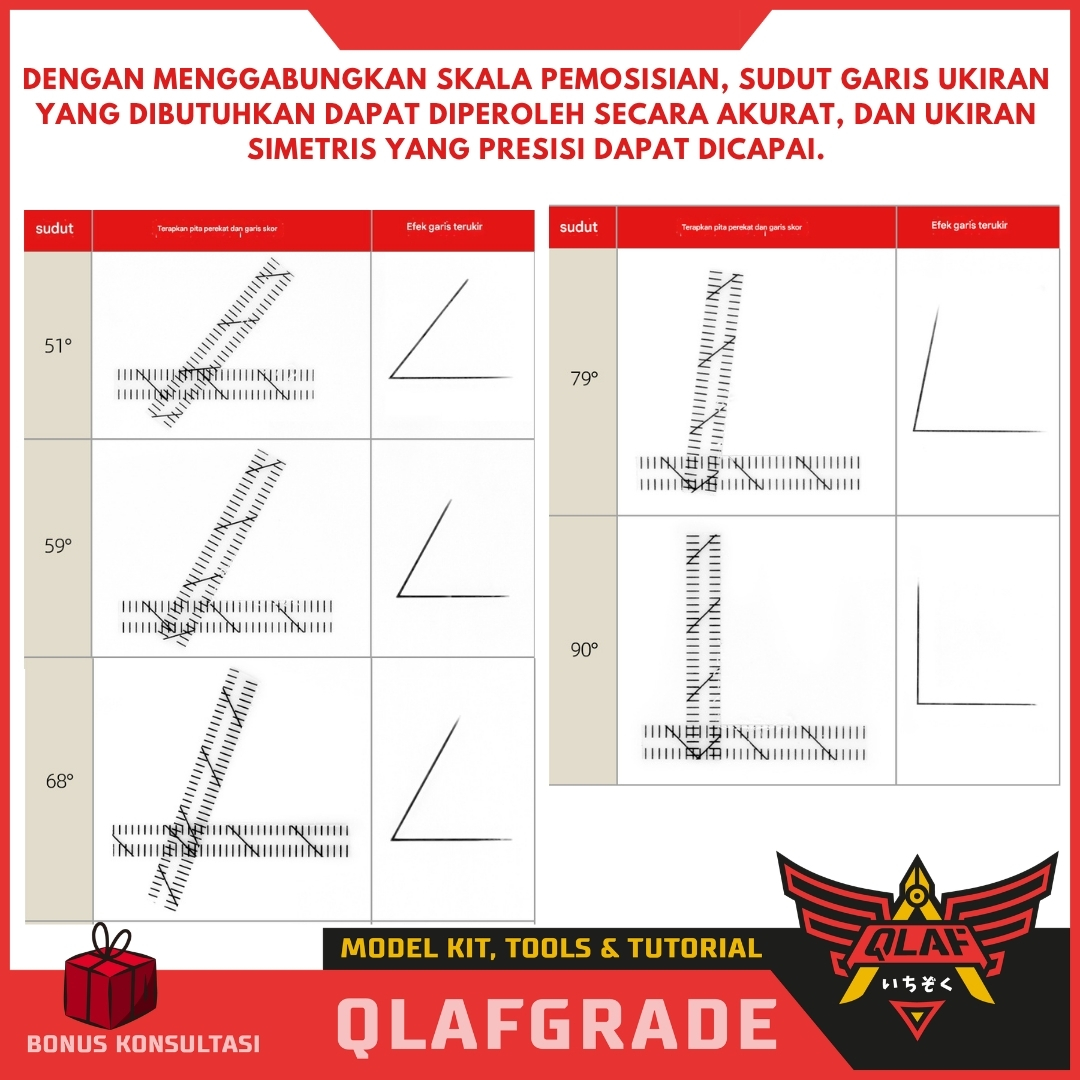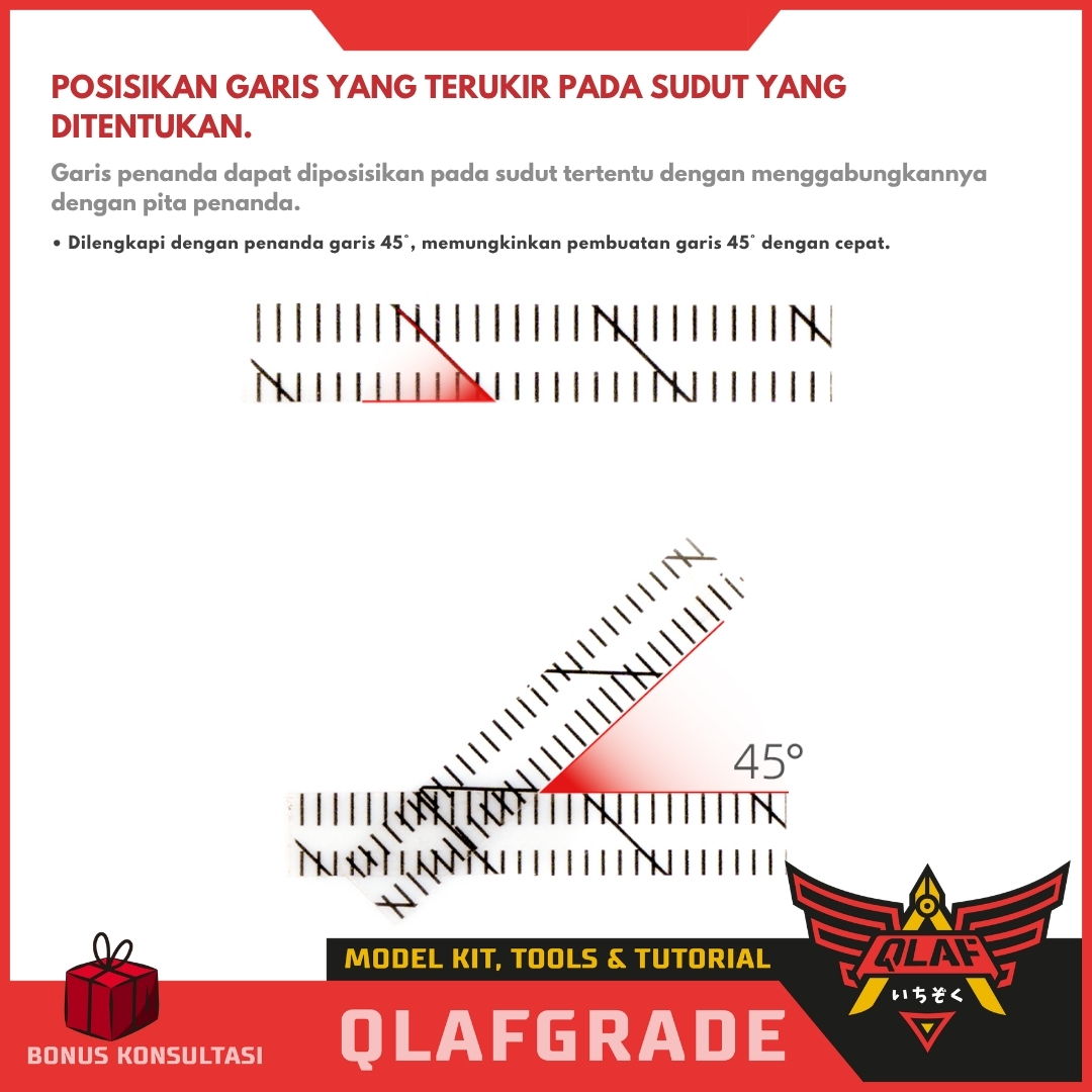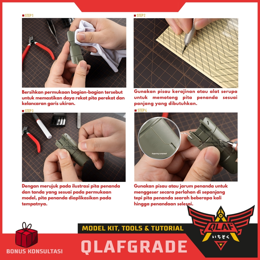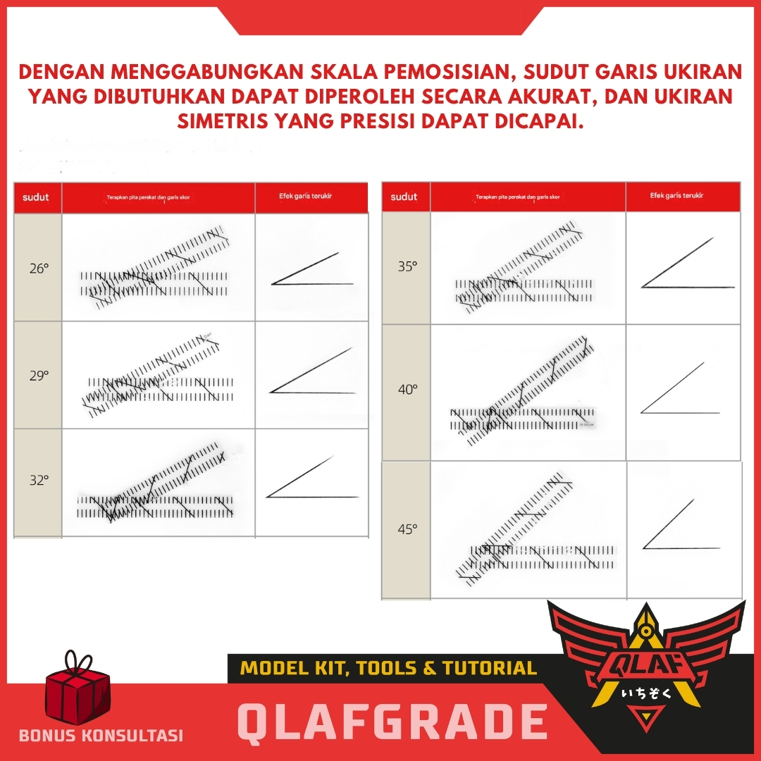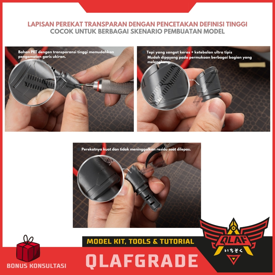 Berbeda dengan selotip biasa, tape ini dilengkapi dengan garis skala dan panduan sudut yang memudahkan Anda memposisikan pahat (scriber) tanpa perlu mengukur manual berkali-kali.
