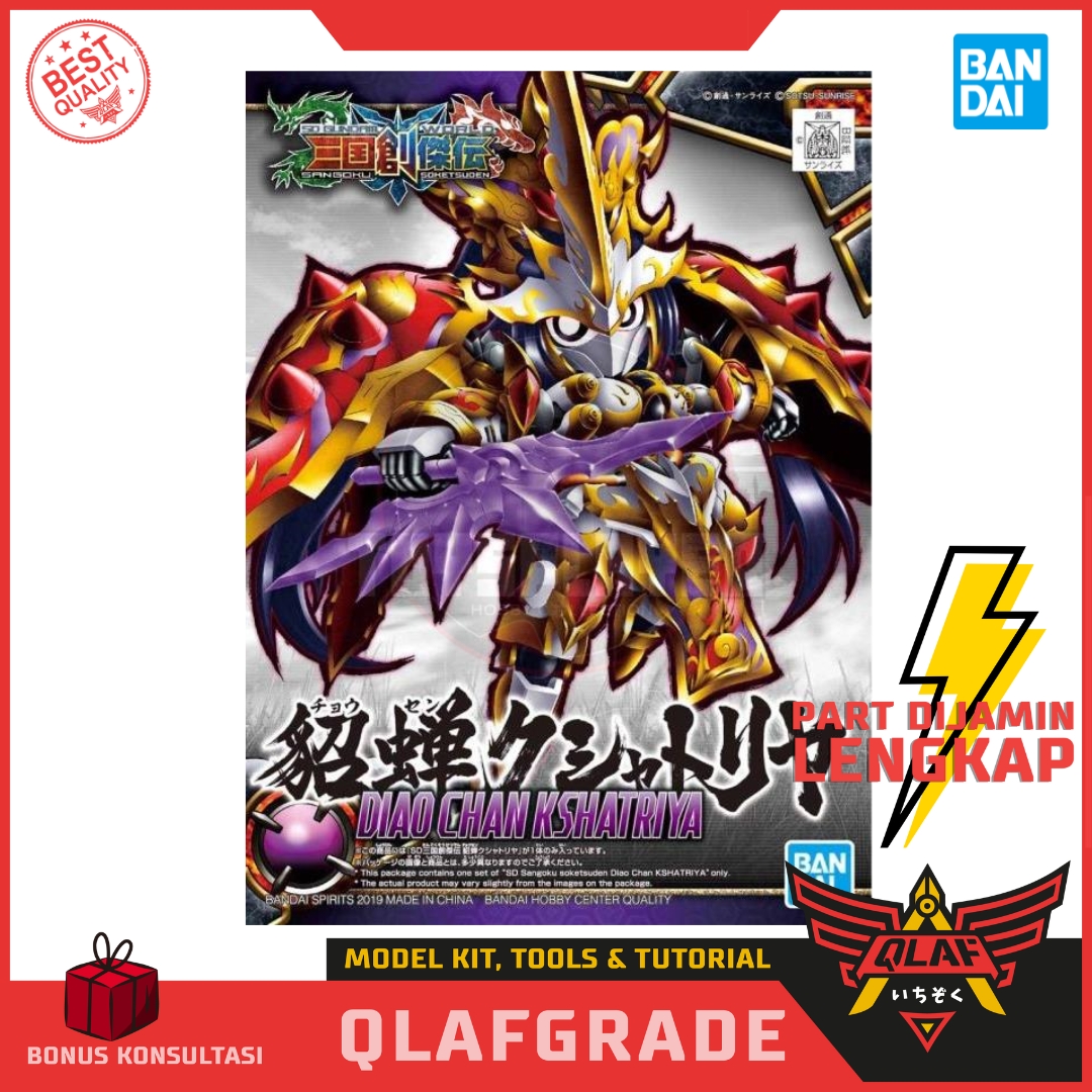 Keterangan Produk: Model kit Diao Chan Kshatriya merupakan adaptasi kreatif dari karakter Diao Chan dalam legenda Tiga Negara, diwujudkan sebagai versi SD dari RX-0 Unicorn Gundam (Kshatriya variant). Memiliki desain warna merah muda dan emas khas, armor bergaya Tiongkok klasik, serta senjata khas seperti kipas perang dan pedang ornamen. Cocok untuk Qlafers yang mengoleksi seri Sangoku Soketsuden atau menyukai fusion budaya Tiongkok–Gundam.