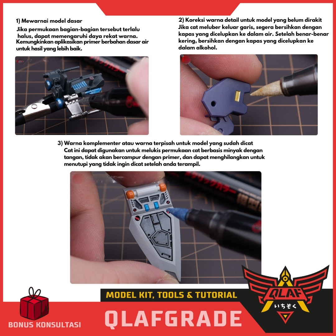 Marker ini bukan marker biasa, tapi sudah menggunakan ujung Brush Tip (Kuas) yang lembut, memudahkan Qlafers mewarnai sudut tersulit sekalipun. Formulanya Water-based, jadi aman banget buat plastik model kit kamu dan nggak bau menyengat.