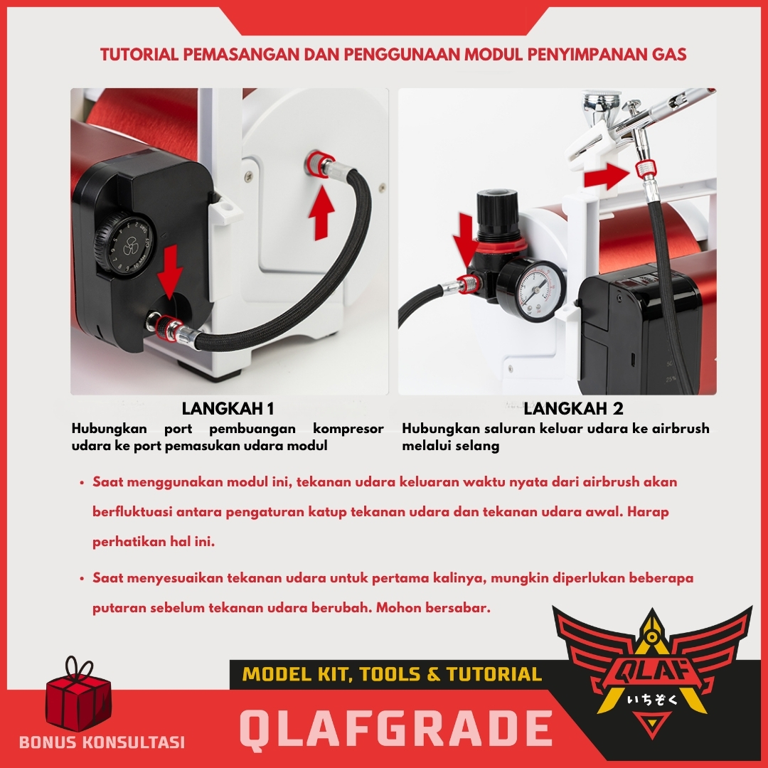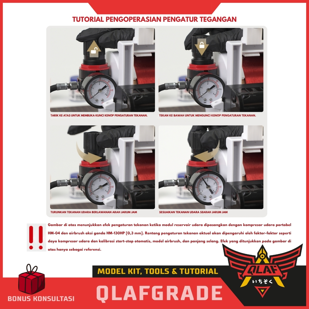modul ini juga menyertakan: Pressure Gauge/Regulator: Untuk mengatur tekanan angin (PSI) secara spesifik sesuai kebutuhan (misal: tekanan rendah untuk detail, tekanan tinggi untuk surface primer). Dual Airbrush Holder: Tempat untuk menaruh dua buah handpiece airbrush secara rapi saat tidak digunakan.