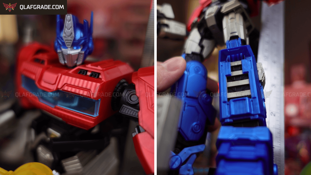 - Artikulasi Lengan Ekstensi: Ada mekanisme extend di bagian siku. Ini sangat membantu ketika Optimus harus berpose memegang senjata atau pose dinamis lain, memberikan jangkauan gerak yang lebih dinamis tanpa terlihat canggung.