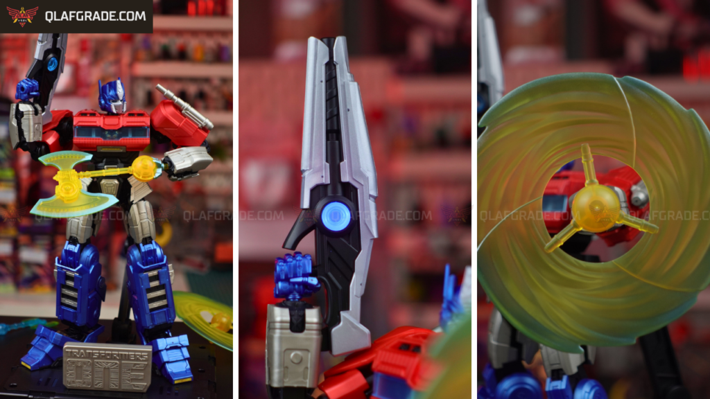 - Tiga Senjata Utama: Terdapat Blaster (dengan aksen biru transparan yang keren jika terkena cahaya), Kapak dengan gradasi warna hijau tosca metalik dan kuning transparan, serta Perisai (Shield) yang bilahnya bisa diputar secara manual untuk menangkis tembakan Megatron!